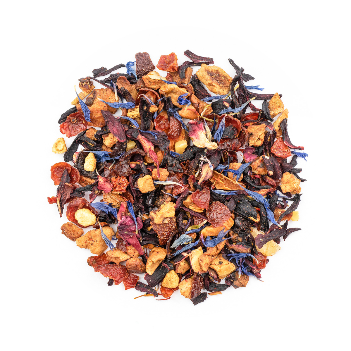 Ein Tee wie ein Augenzwinkern vom Weihnachtsmann. Fruchtige Apfelstücke und Hibiskusblüten treffen auf zarte Mandelstücke. Orangenschalen und Kokosraspeln verleihen der Mischung eine festliche Tiefe, während Kornblumen und Färberdisteln für winterliches Funkeln sorgen. Der Geschmack: ein fröhlicher Kirschpunsch – weich, rund und mit einem Hauch Weihnachtszauber.