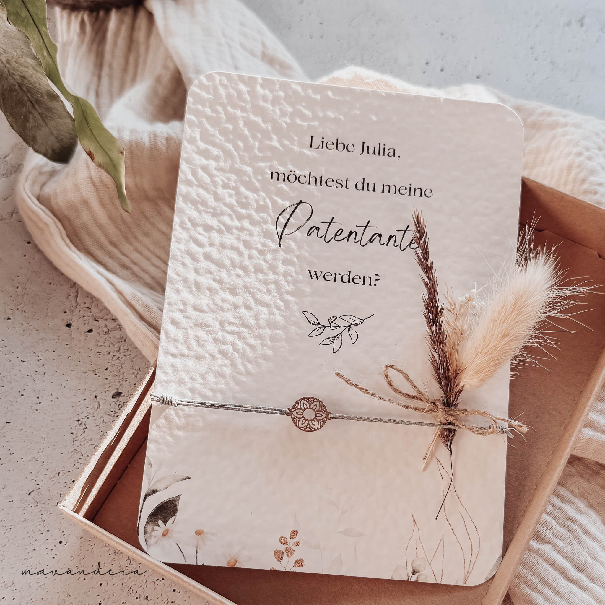 Du suchst eine einzigartige und liebevolle Art, deine zukünftige Goli / Patentante zu fragen? Unsere handgefertigte Geschenkbox aus Natur-Kraftkarton mit einem edlen, dezenten Armband macht diesen besonderen Moment noch unvergesslicher. ✨