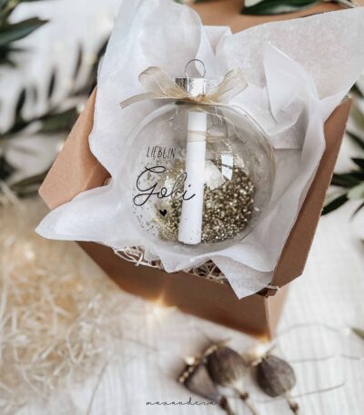 Weihnachtskugel 8 cm Echtglas mit Glitzer | für Gutschein & Botschaft – Aufdruck nach Wunsch