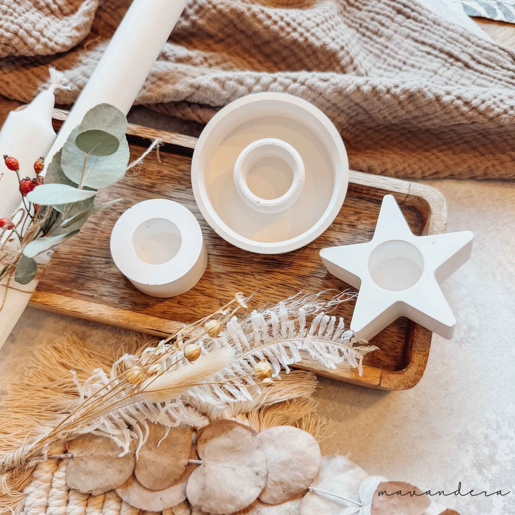 Der minimalistische Stil fügt sich harmonisch in jedes Wohnambiente ein und lässt sich mühelos zu verschiedenen Anlässen und Jahreszeiten dekorieren. Ideal für den modernen Look, passt dieser Kerzenhalter zu jedem Einrichtungsstil und lässt deiner Kreativität freien Lauf! Der kleine Kerzenhalter ist die ideale Ergänzung zu unseren handgemachten Spruchkerzen. Spiele mit Farben, indem du ihn mit verschiedenen Kerzen dekorierst, um deinem Tisch oder deinem Zuhause eine persönliche Note zu verleihen. Warum dieser Kerzenhalter? Gefertigt aus glattem Guss, beeindruckt er mit seiner klaren Oberfläche und zeitlosen Ästhetik, die ihm einen eleganten Glanz verleiht. Als handgefertigtes Unikat ist er ein Highlight für dein Zuhause. Hinweise zur Pflege: Die Produkte dieser Serie sind für die Nutzung im Innenbereich gedacht und eignen sich besonders gut für dekorative Zwecke. Feuchträume wie Badezimmer sind weniger geeignet, aber ein sanftes Abwischen mit einem feuchten Tuch ist problemlos möglich. Maße: Kleiner: 4,5 x 4,5 cm Mittel: 7,0 x 7,0 cm Stern: 6,5 x 6,5 cm Ob als Geschenk für einen lieben Menschen oder für dein eigenes Zuhause – dieser Kerzenhalter ist eine wundervolle Wahl! 💡 Achtung: Es ist sorgfältige Handarbeit, jedoch kleine Abweichungen im Material können auftreten HERSTELLER: mavandera family store e.u., Flurstraße 13, 4311 Schwertberg Mail/Kontakt: office@mavandera.com