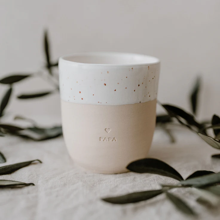 Wunderschöner Becher mit Prägung PAPA – auf Wunsch kannst du auch jede Tasse von uns als fertig dekoriertes & verpacktes Geschenk kaufen. Du findest in der Rubrik Eulenschnitt einen Artikel „Deko Tasse„, bestelle diesen mit und wähle zusätzliche Add-Ons wie Gewürze, Tees, Trockenblumen, Seifen, uvm. nach Wunsch.