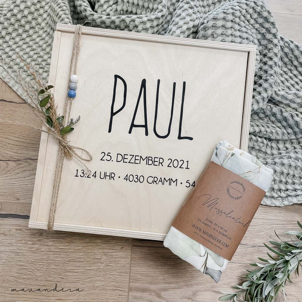 Hochwertige Holzbox inkl. Personalisierung – eine wunderschöne Erinnerungskiste für besondere Momente, die ersten Erlebnisse, das Home-Coming Outfit, den Schnuller, und Platz für viele weitere persönliche Erinnerungen.