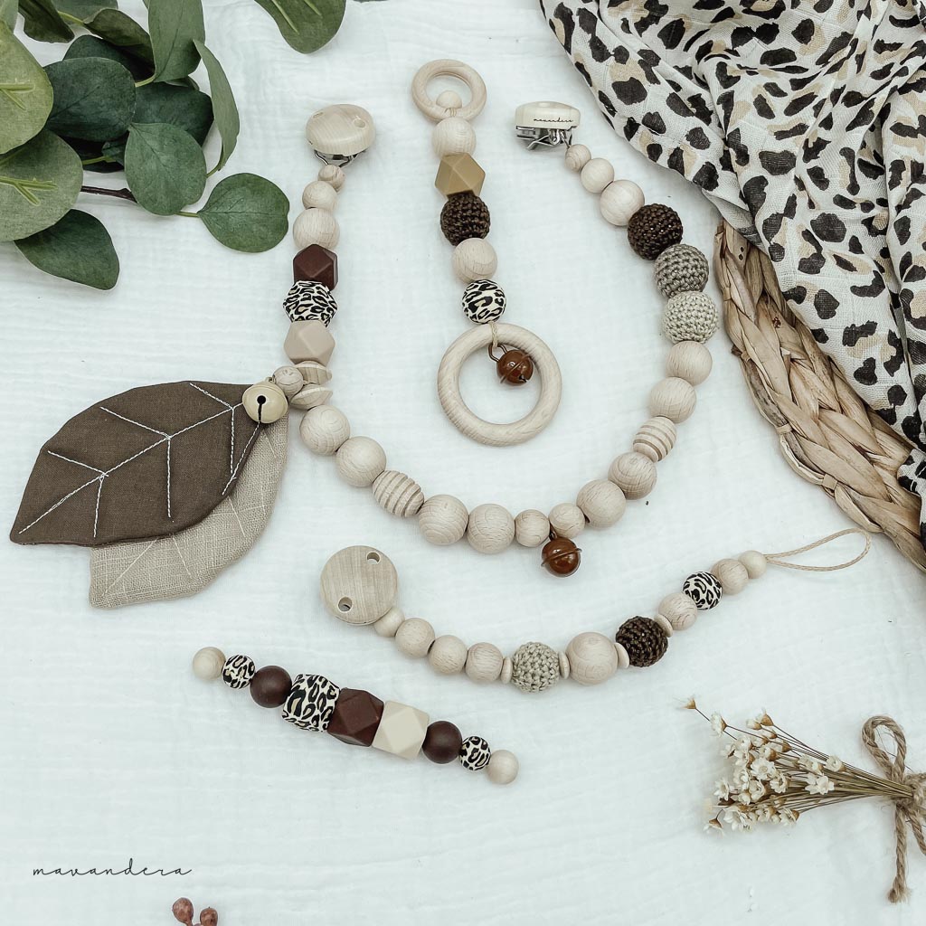 Leo-Set | 5-teilig Kinderwagenkette, Schnullerkette, Spielkette, Zahnungswurmi, Musselintuch (Personalisierung möglich)