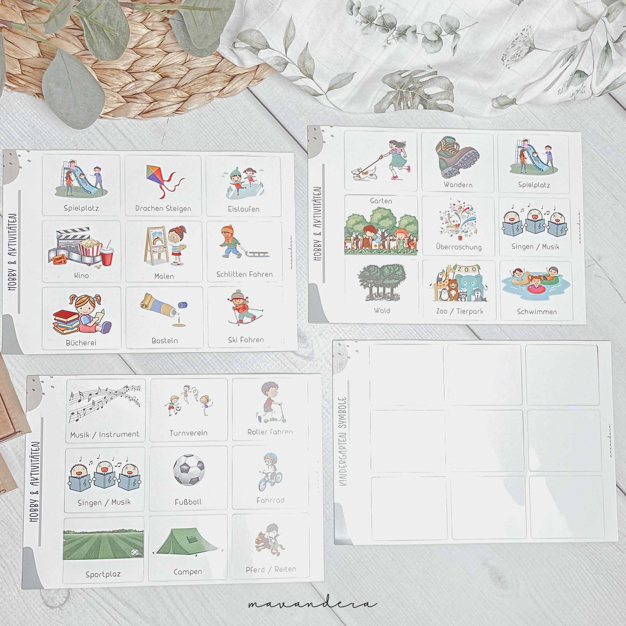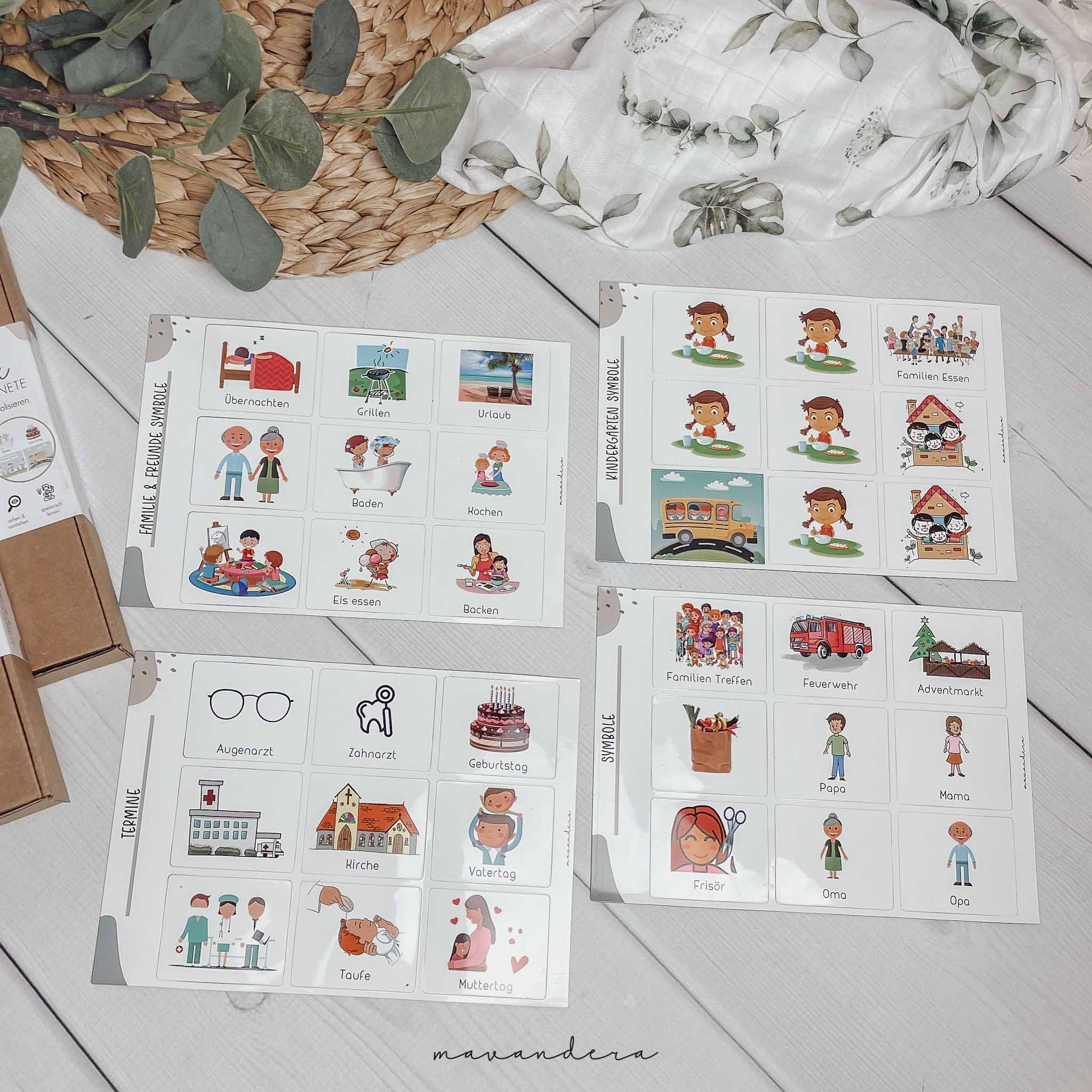 90 Symbolkärtchen: 5x Kindergarten, 5x Schule, 5x Bus fahren, 5x Lernen/Hausaufgaben, 5x Essen (Kiga/Schule), 2x Wochenende Karte, Einkaufen (Tüte), Familien-Essen, Familien-Treffen, Spielende Kinder (Spielgruppe zB), Baden, Backen, Kochen, Garten, Oma, Opa, Mama, Papa, Oma&Opa, Arzt, Krankenhaus, Augenarzt/Optiker, Zahnarzt, Gassi gehen, Zoo/Tierpark, Drachen steigen, Grillen, Fußball, Urlaub, Zelten, Wandern, Muttertag, Vatertag, Wald, Kino, Geburtstag, Überraschung, Taufe, Kirche, Übernachten, Frisör, 2x Spielplatz, Frühling, Sommer, Herbst, Winter, Weihnachten, Silvester, Nikolaus, Halloween, Ostern, Basteln, Schwimmen, Malen, Sportplatz, Bücherei, Adventmarkt, Eis essen, Feuerwehr, Roller fahren, Fahrrad, Pferd/Reiten, Singen, Musik/Instrument, Turnverein, Skifahren, Schlitten fahren, Eislaufen.