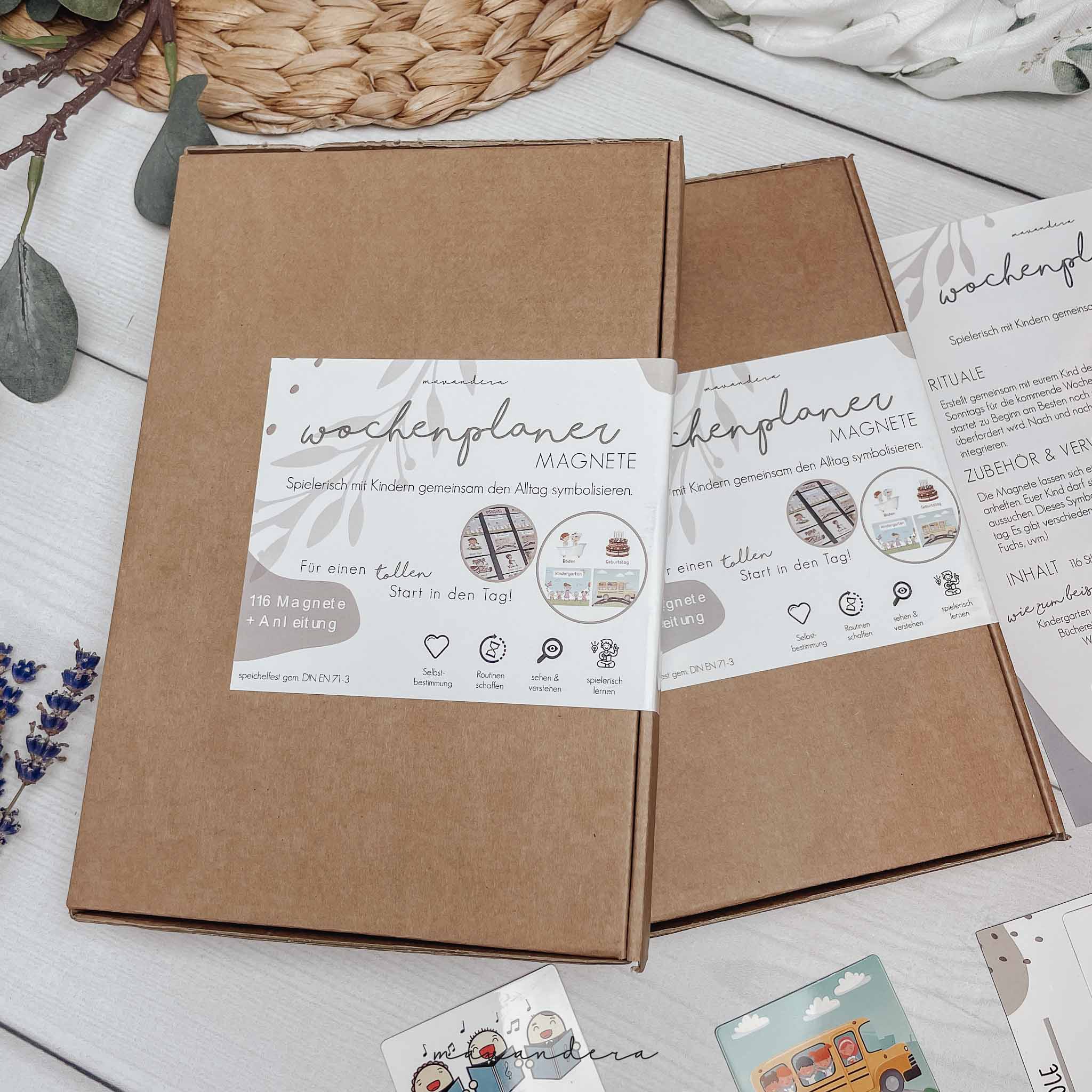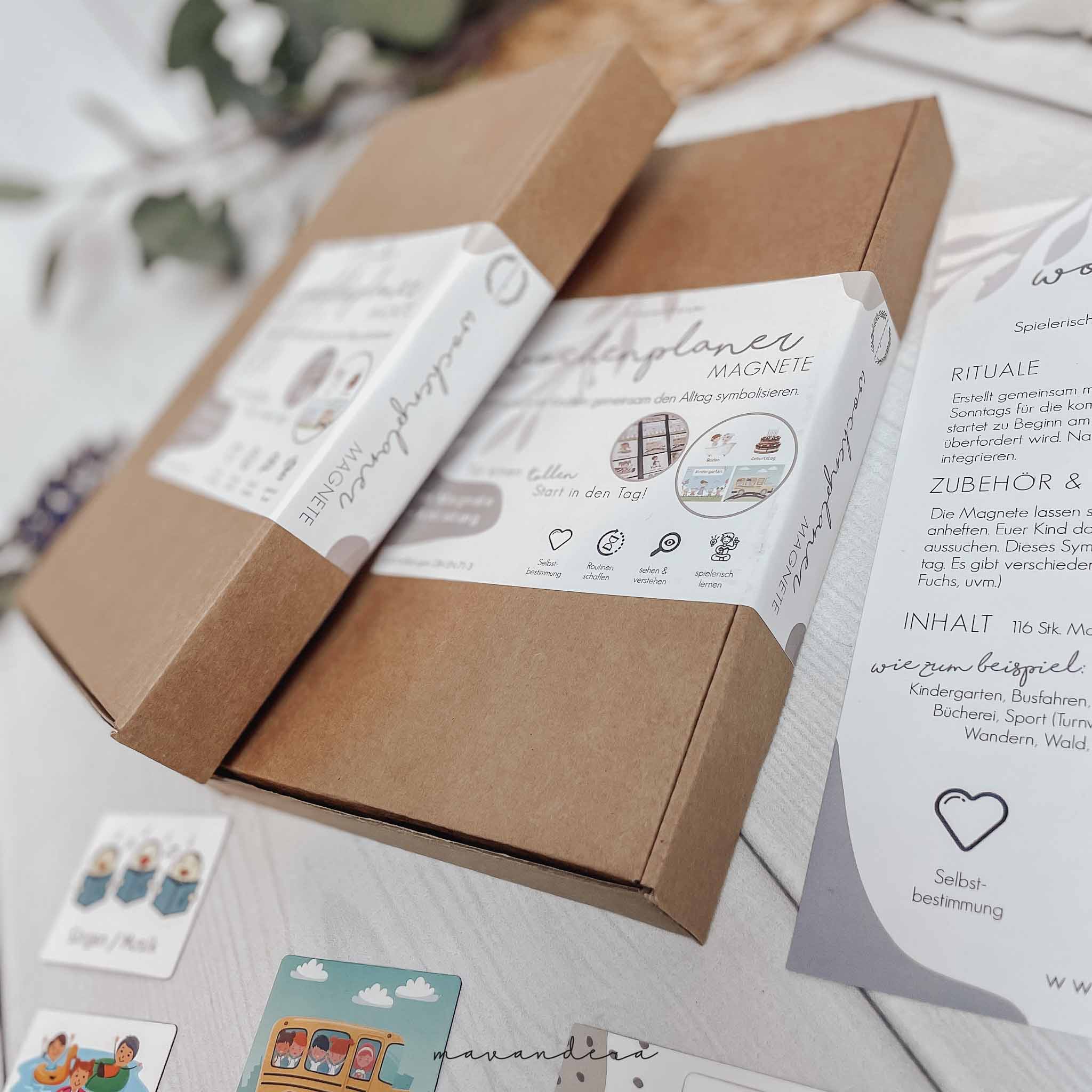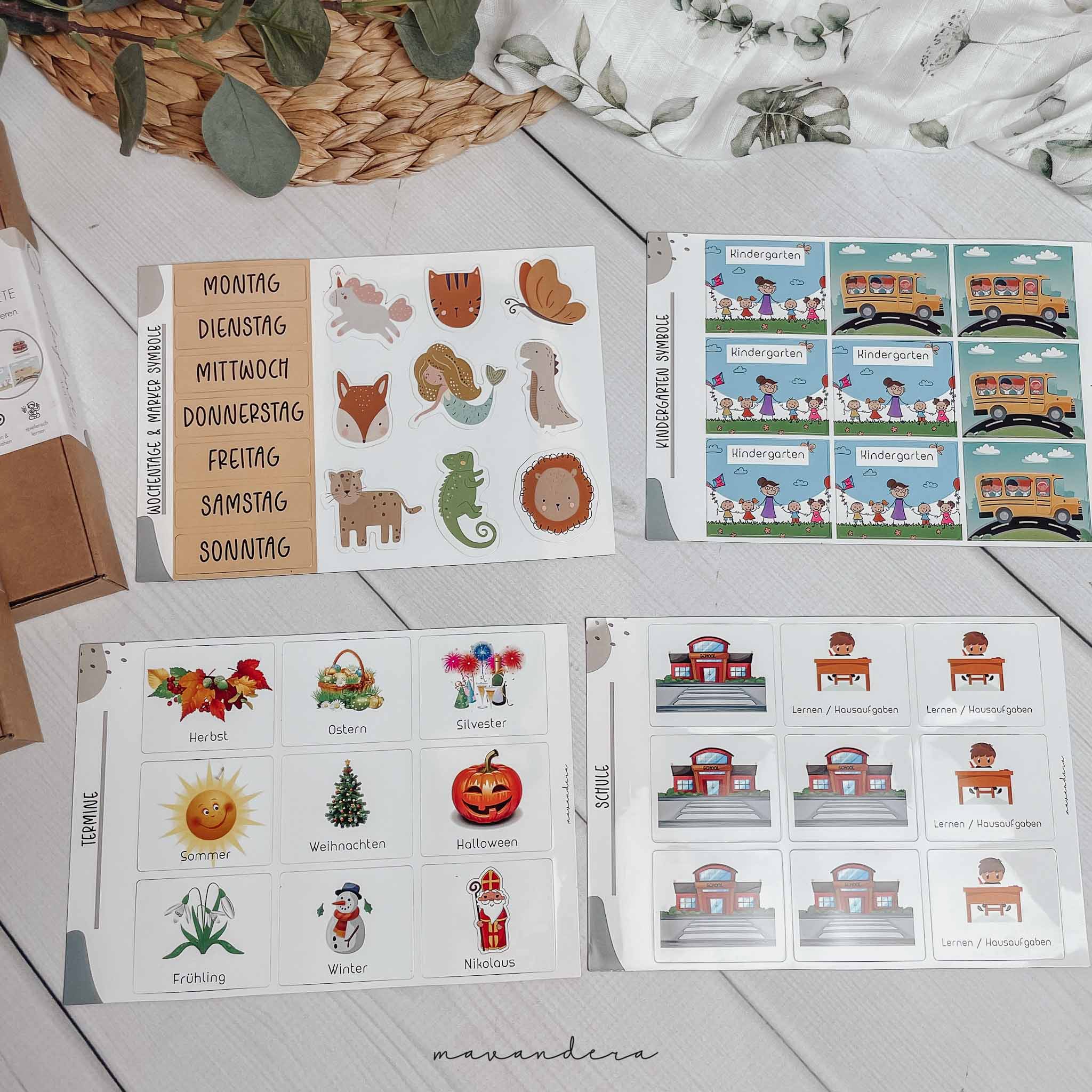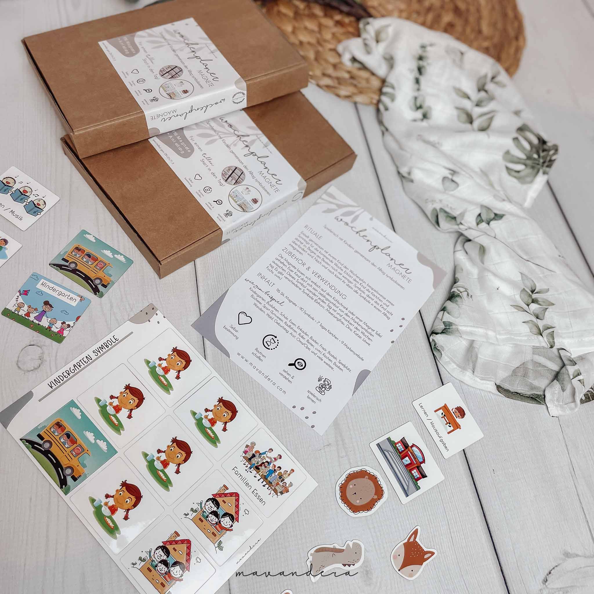 Das Set besteht aus insgesamt 116 Magnet Kärtchen davon sind viele unterschiedliche wie Kindergarten, Schule, Bus Fahren, Ausflüge, Hobbys, Ereignisse (Ostern, Weihnachten, Sommer, ..), Tages Kärtchen und auch Marker Symbole (Einhorn, Löwe, Fuchs, Tiger, Meerjungfrau, Dino,….) sowie auch 9 Leer Kärtchen.