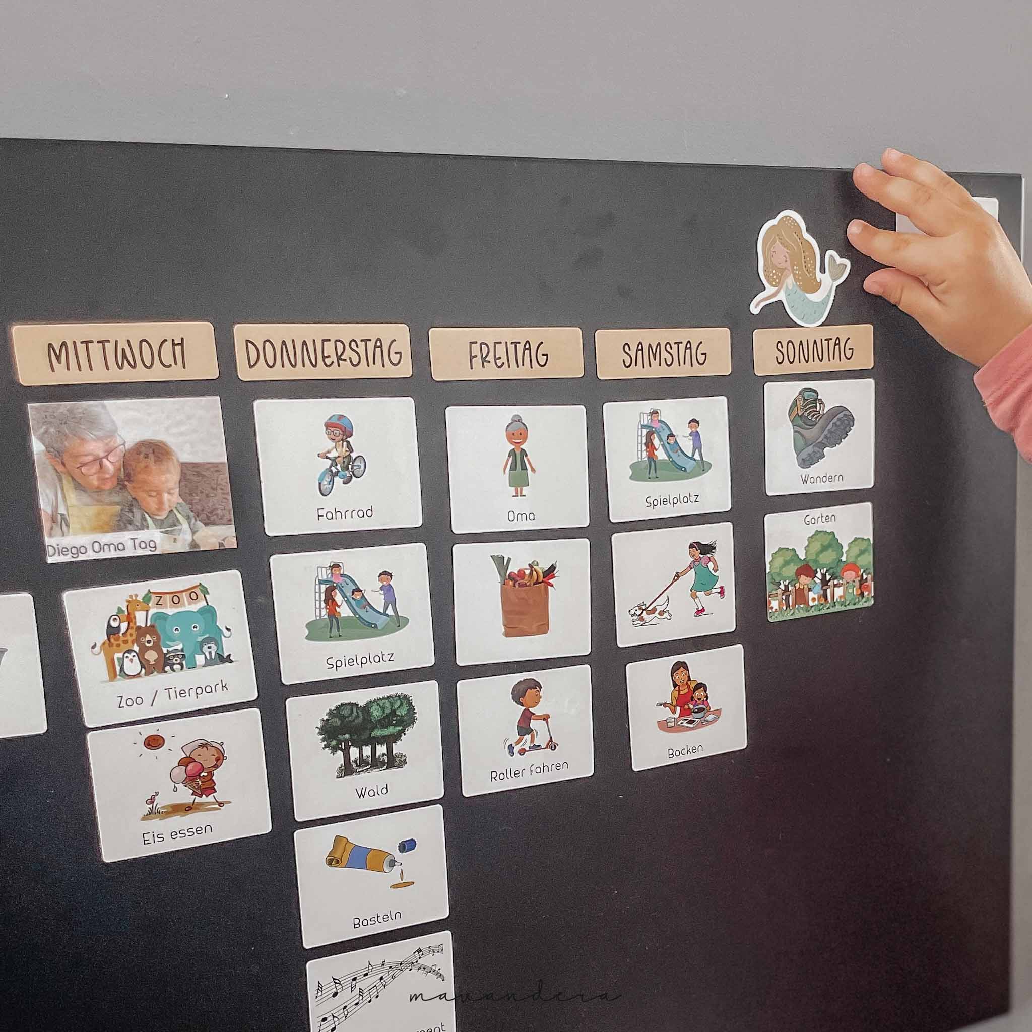 Umfangreicher Wochenplaner mit über 116 Magnet Kärtchen, Tages-Marker Symbolen & Wochentage für Kindergarten, Schule, und Hobbies.