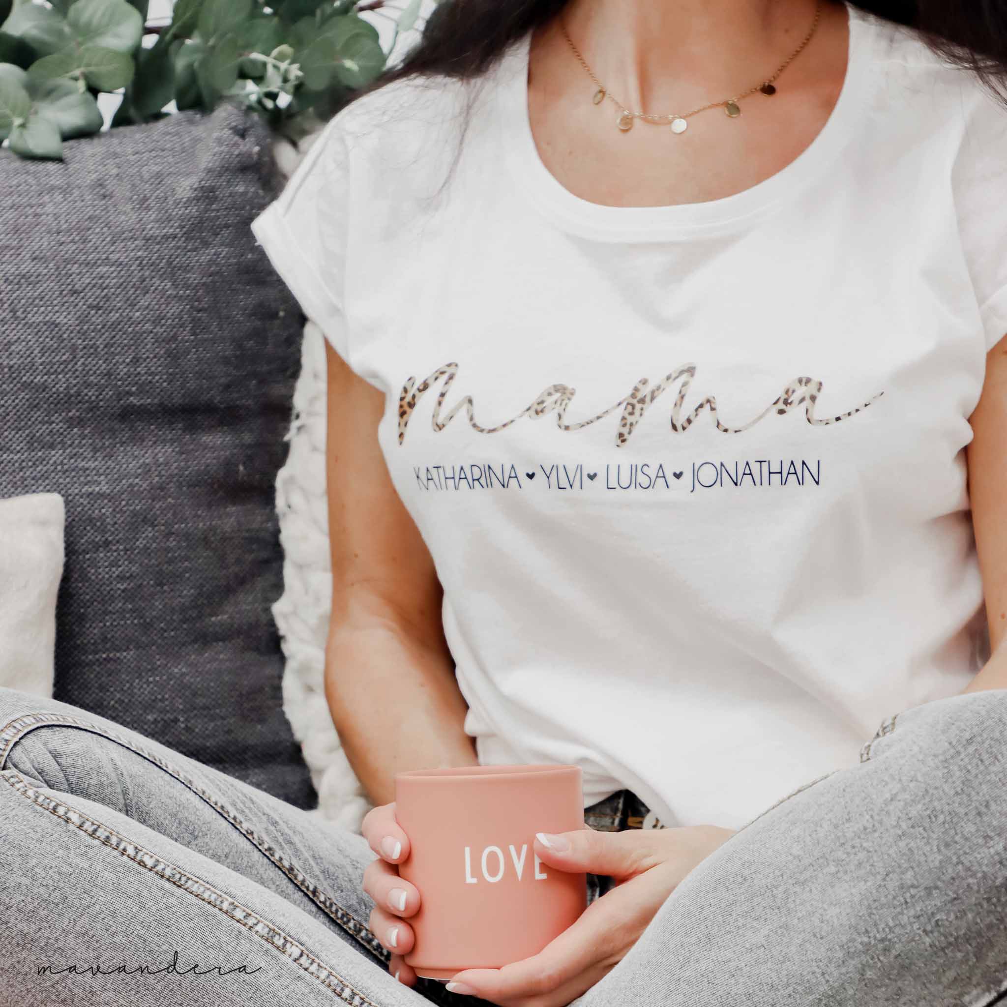 Wir fertigen dieses Design auf unterschiedlichen Textilien individuell ganz nach deinen Wünschen. Klick dich durch, wähle dein Wunschtextil, deinen Titel (zB wie hier Mama) und deine Personalisierung (Kindernamen). Automatisch machen wir immer ein Herz als Trennzeichen bei mehr Kindern – ich würde dich bitten die Kindernamen mit einem / zu trennen, nicht dass wir irrtümlich einen Doppelnamen trennen!
