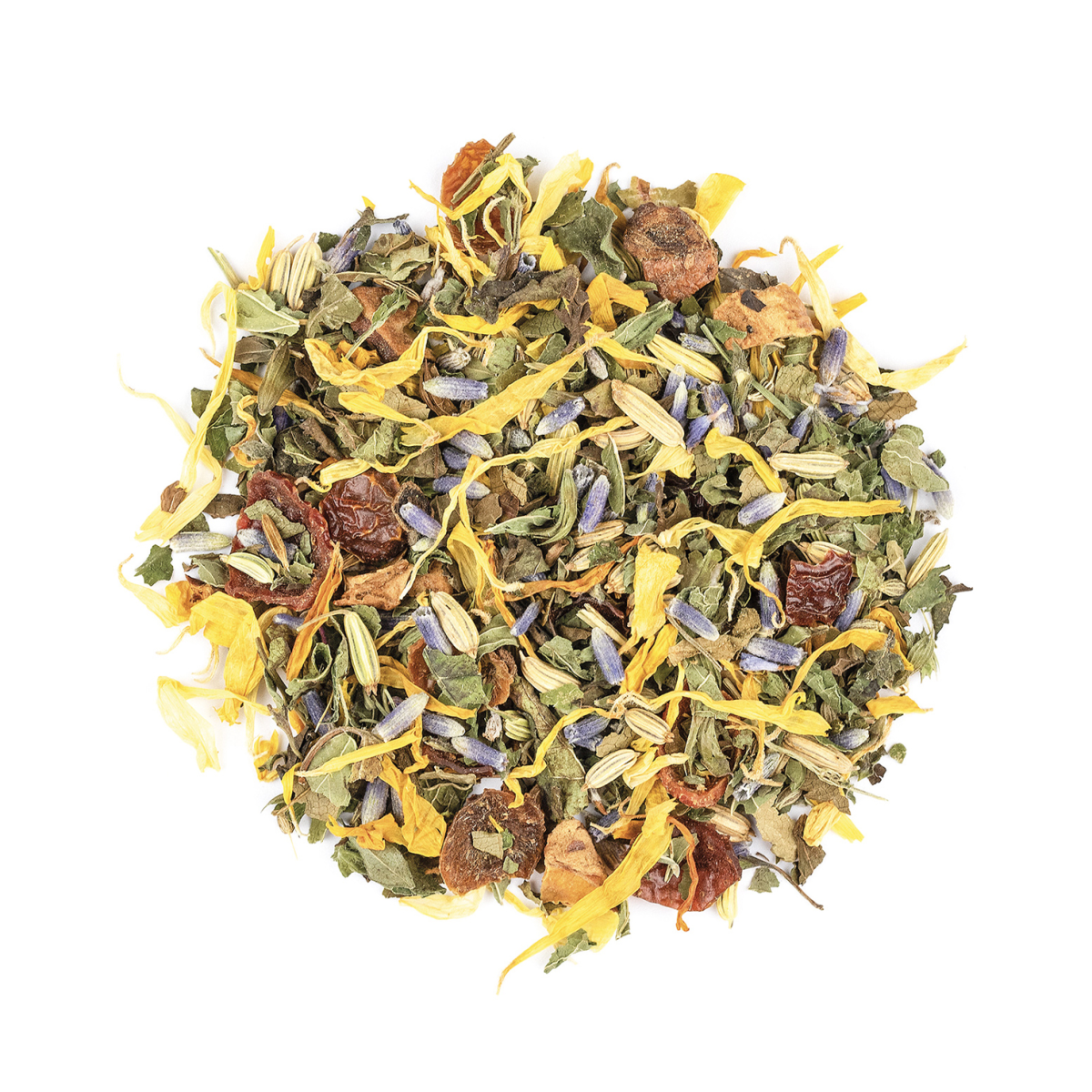 Melissenblätter, Apfelstücke, Fenchel, Anis, Hagebuttenschalen, Kreuzkümmel, Lavendelblüten (6%), Ringelblumenblüten, süße Brombeerblätter.