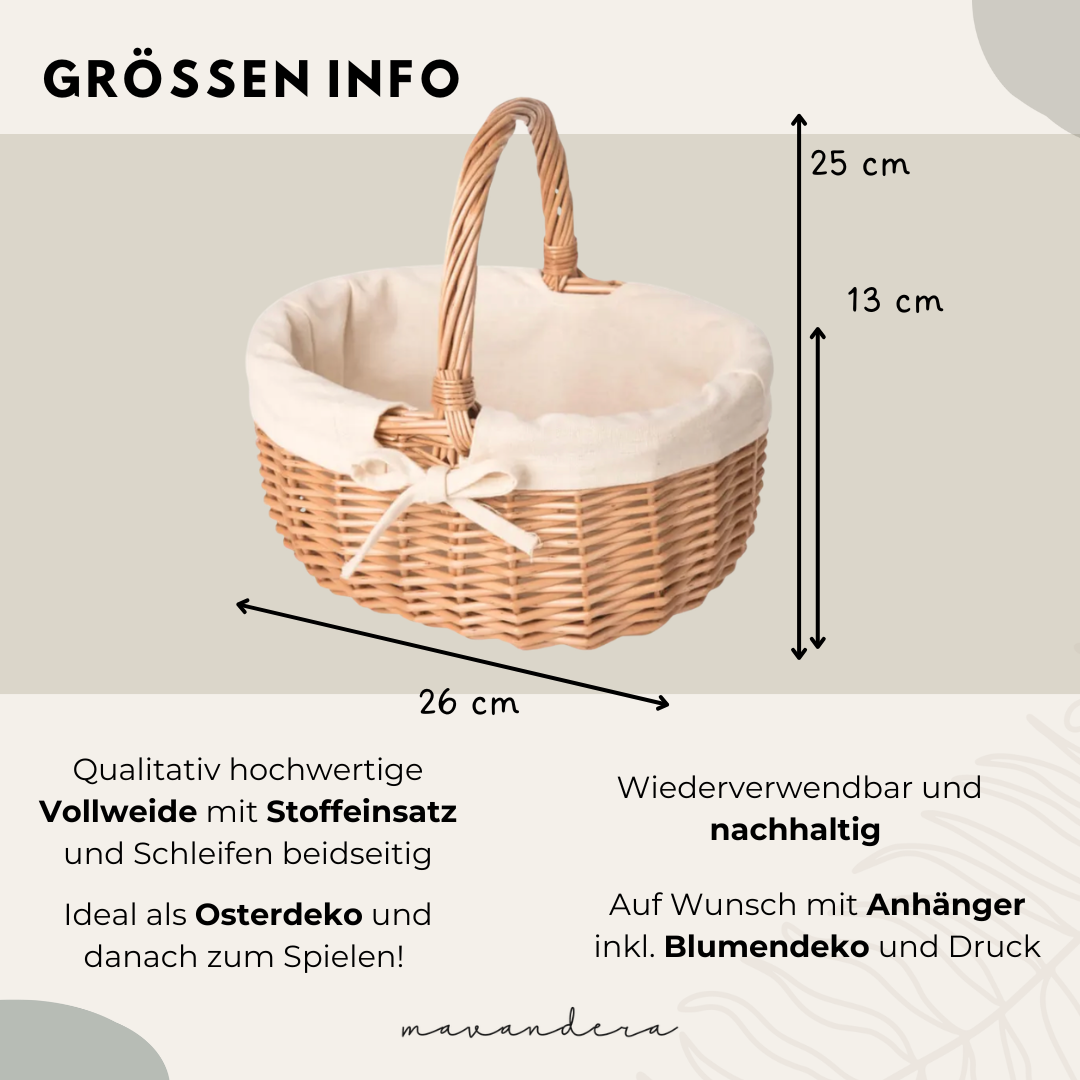 Handgeflochtener Osterkorb aus hochwertiger Vollweide mit weichem Baumwollstoff – optional mit Anhänger und auf Wunsch personalisiert (am Stoff). Perfekt für die Eiersuche, als Ostergeschenk für Kinder oder liebevolle Geschenkidee zu Ostern.