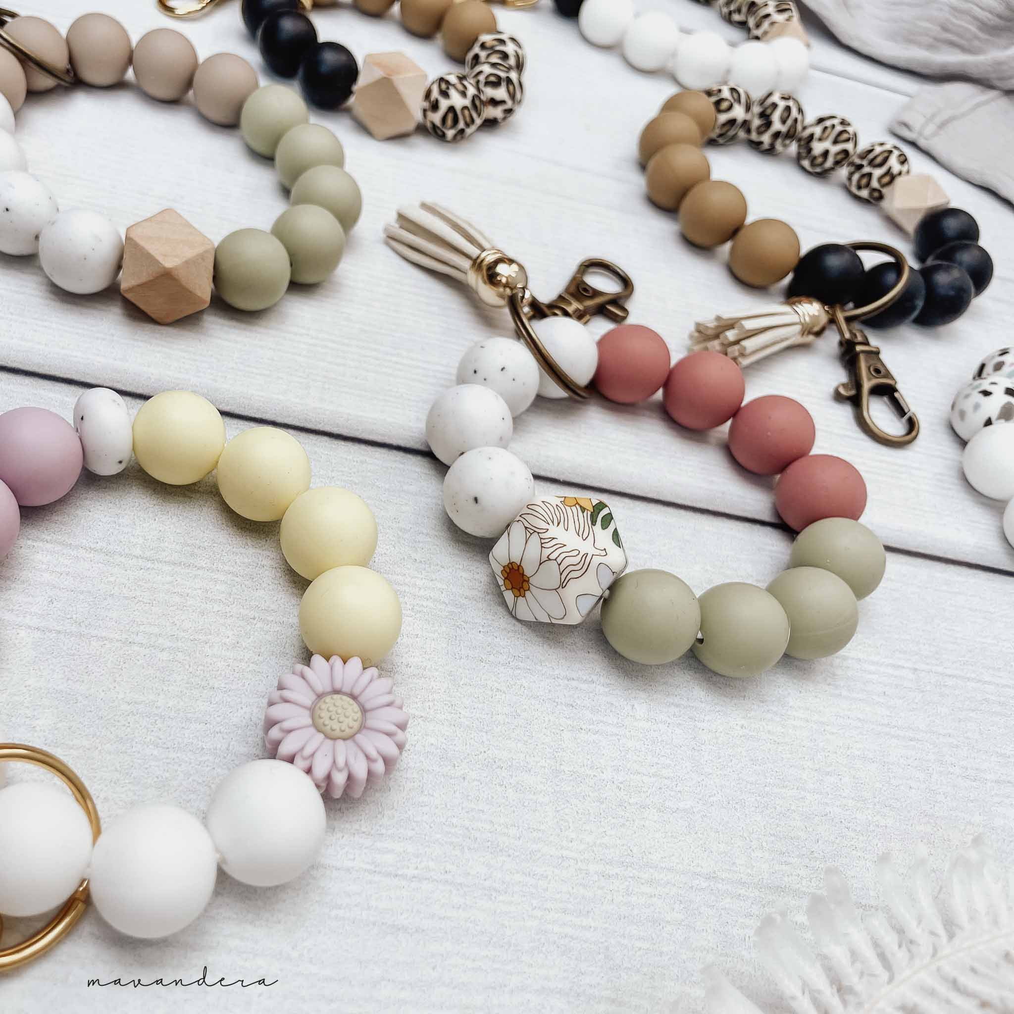 Praktischer Schlüsselanhänger fürs Armgelenk gefertigt aus Silikon-/ Holzperlen, mit Karabiner und Schlüsselring.