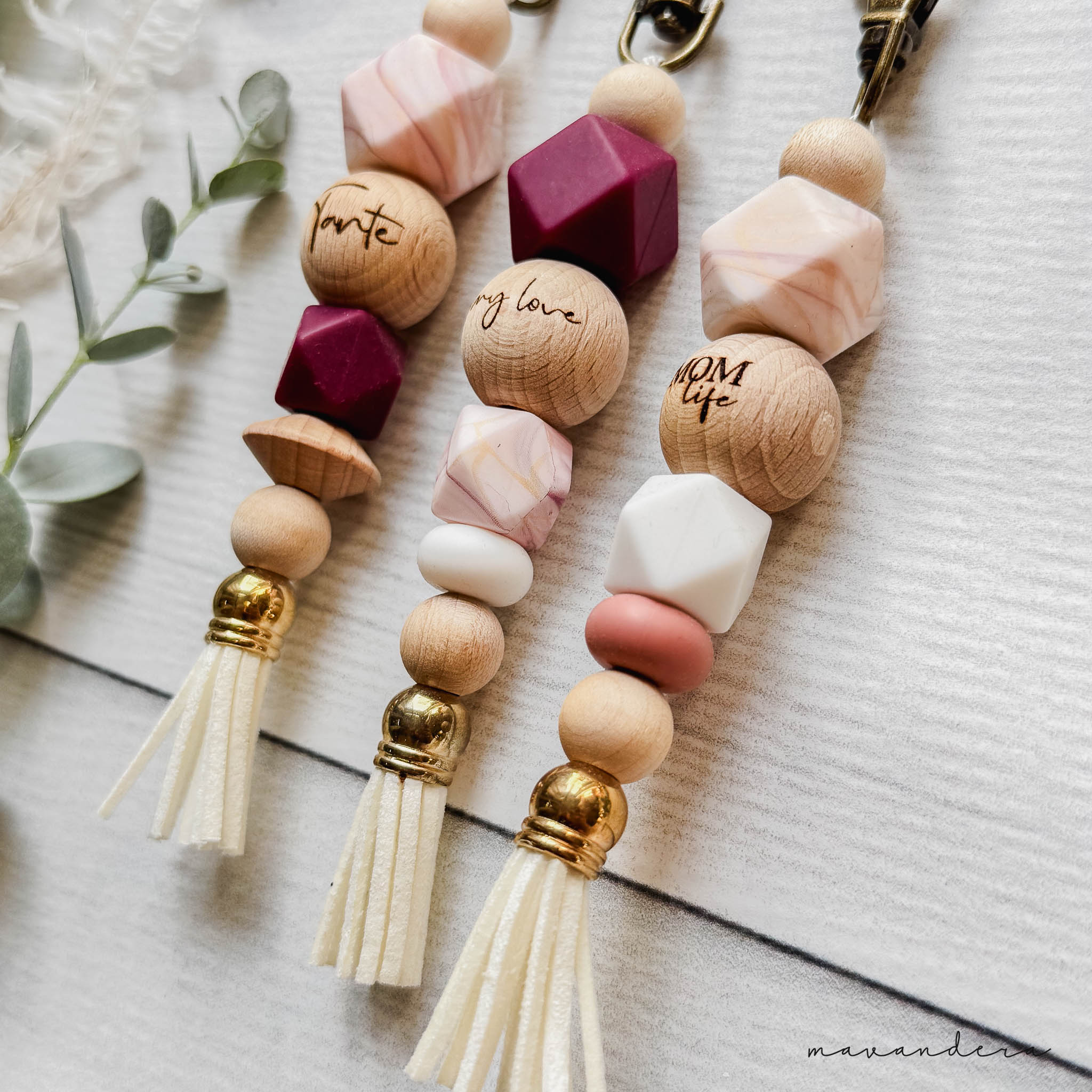 Handgefertigter Schlüsselanhänger mit optionaler Wunschgravur und individueller Farbgestaltung. Wähle Design, Farbe, Quaste und Verschluss – dein persönliches Unikat!