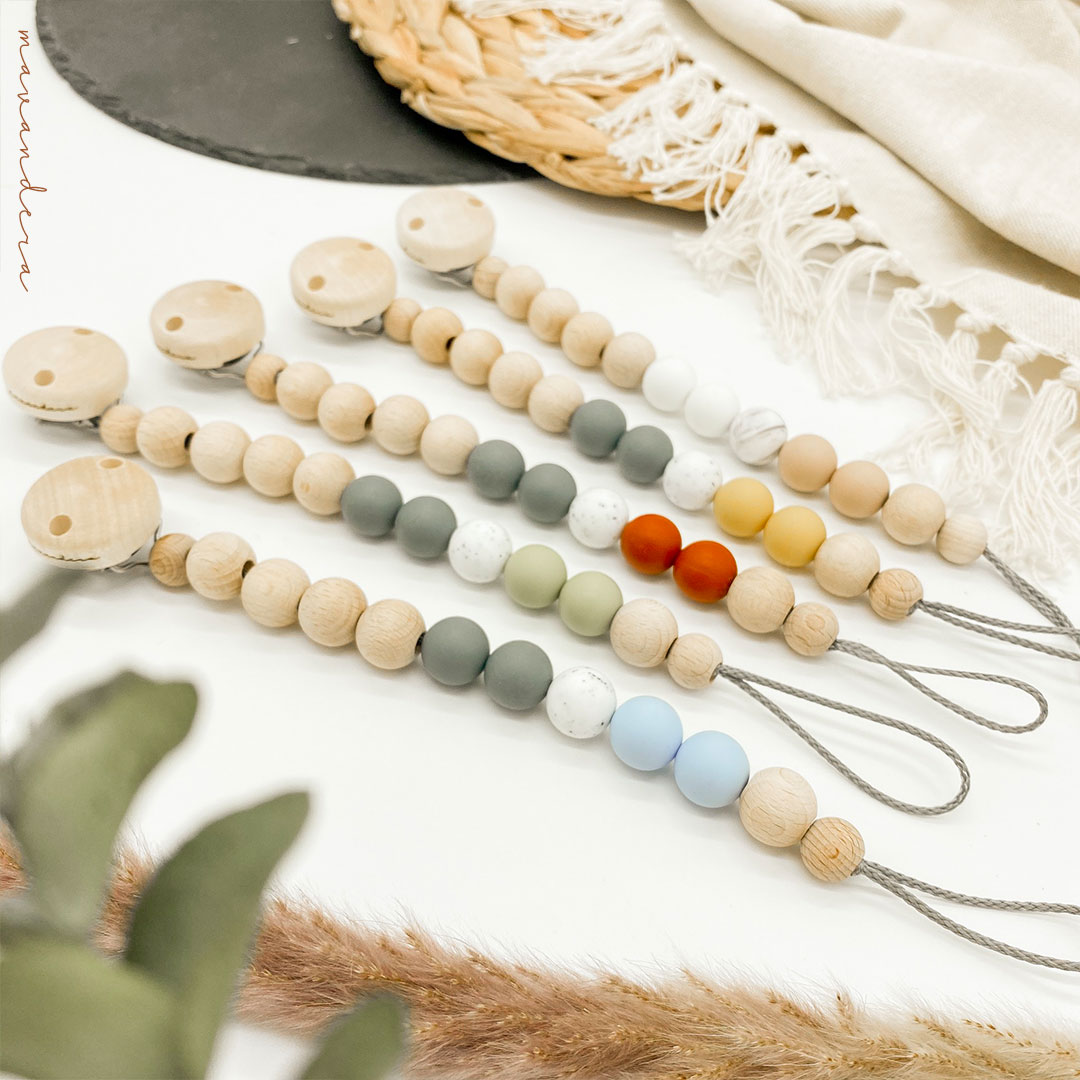 Die Schnullerkette ist ein hübsches Accessoire und ein perfekter Wegbegleiter – mittels dem Clip einfach auf Kleidung befestigen und so kann der Schnuller nicht mehr verloren gehen, oder am Boden fallen. Jede Schnullerkette wird von uns sorgfältig unter Einhaltung der gesetzlich gültigen Normen gefertigt. Alle Materialien sind speichelecht und gem. DIN EN 71-3 geprüft – wir verwenden nur naturbelassene Clips sowie Holzperlen aus Deutschland, alle Silikonprodukte sind lebensmittelecht, die Häkelperlen werden von uns selbst hergestellt.