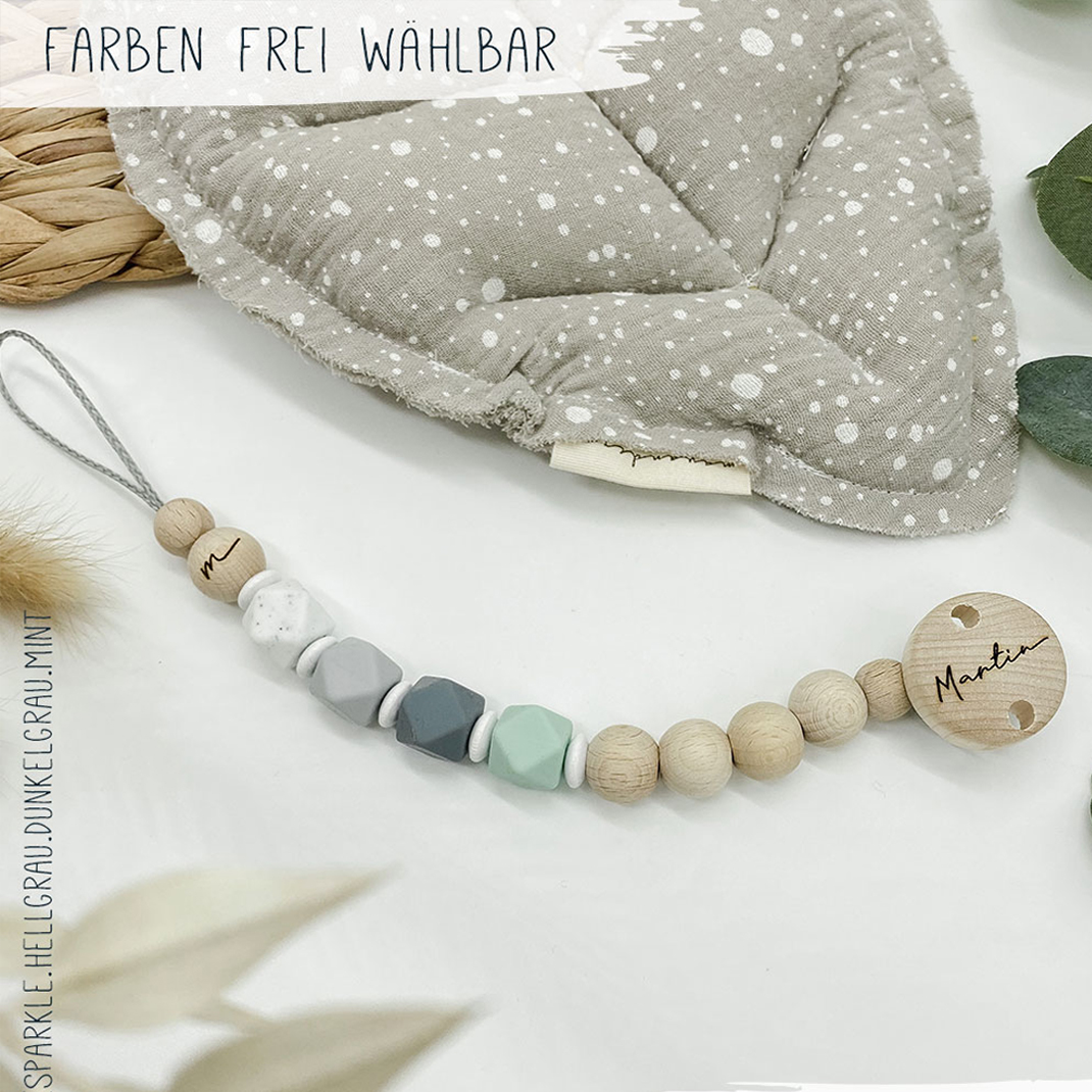 Die Schnullerkette ist ein hübsches Accessoire und ein perfekter Wegbegleiter – mittels dem Clip einfach auf Kleidung befestigen und so kann der Schnuller nicht mehr verloren gehen, oder am Boden fallen.  Jede Schnullerkette wird von uns sorgfältig unter Einhaltung der gesetzlich gültigen Normen gefertigt. Alle Materialien sind speichelecht und gem. DIN EN 71-3 geprüft – wir verwenden nur naturbelassene Clips sowie Holzperlen aus Deutschland, alle Silikonprodukte sind lebensmittelecht, die Häkelperlen werden von uns selbst hergestellt.