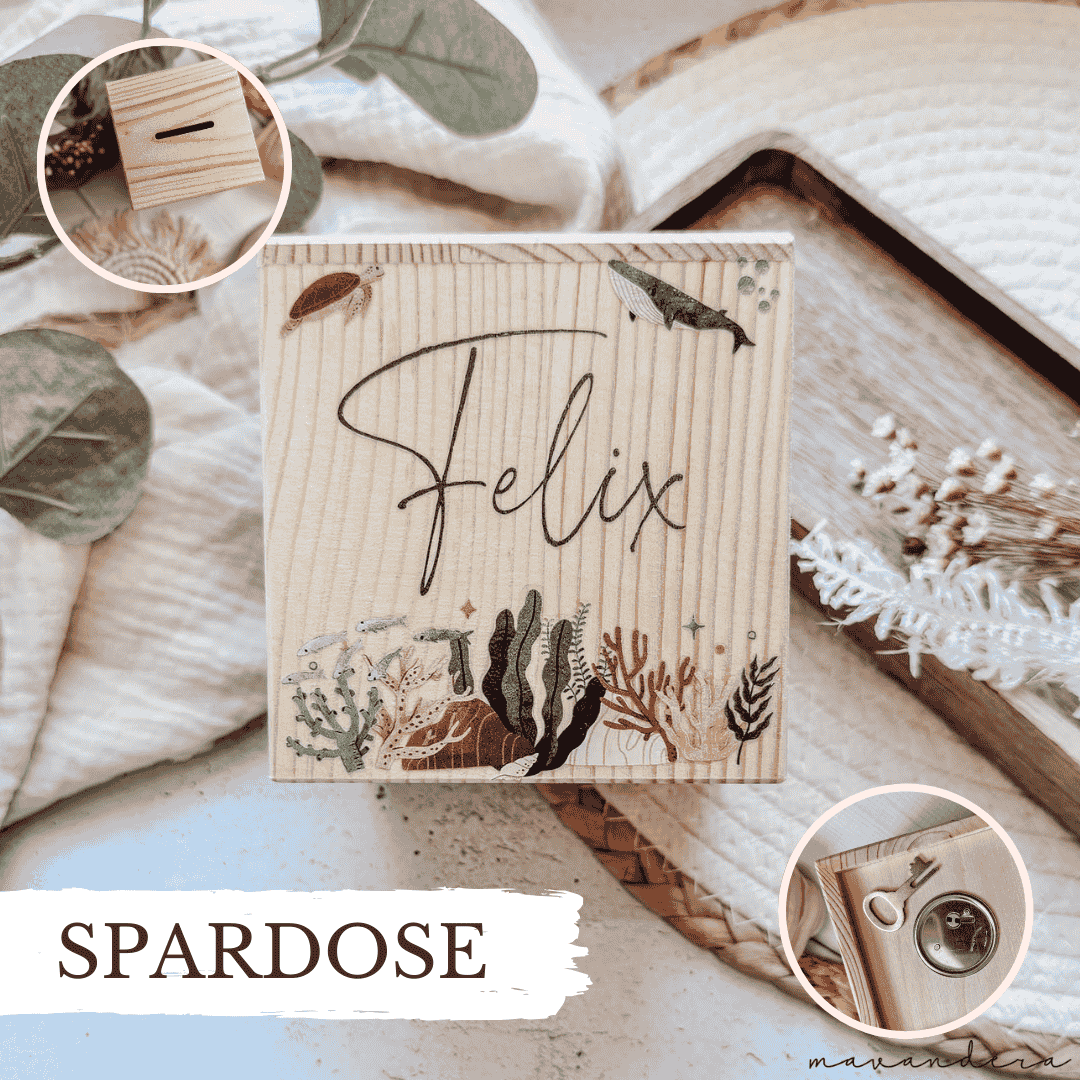 Personalisierte Spardose, regional gefertigt aus Massivholz und liebevoll in deinem Wunschdesign von uns bedruckt.