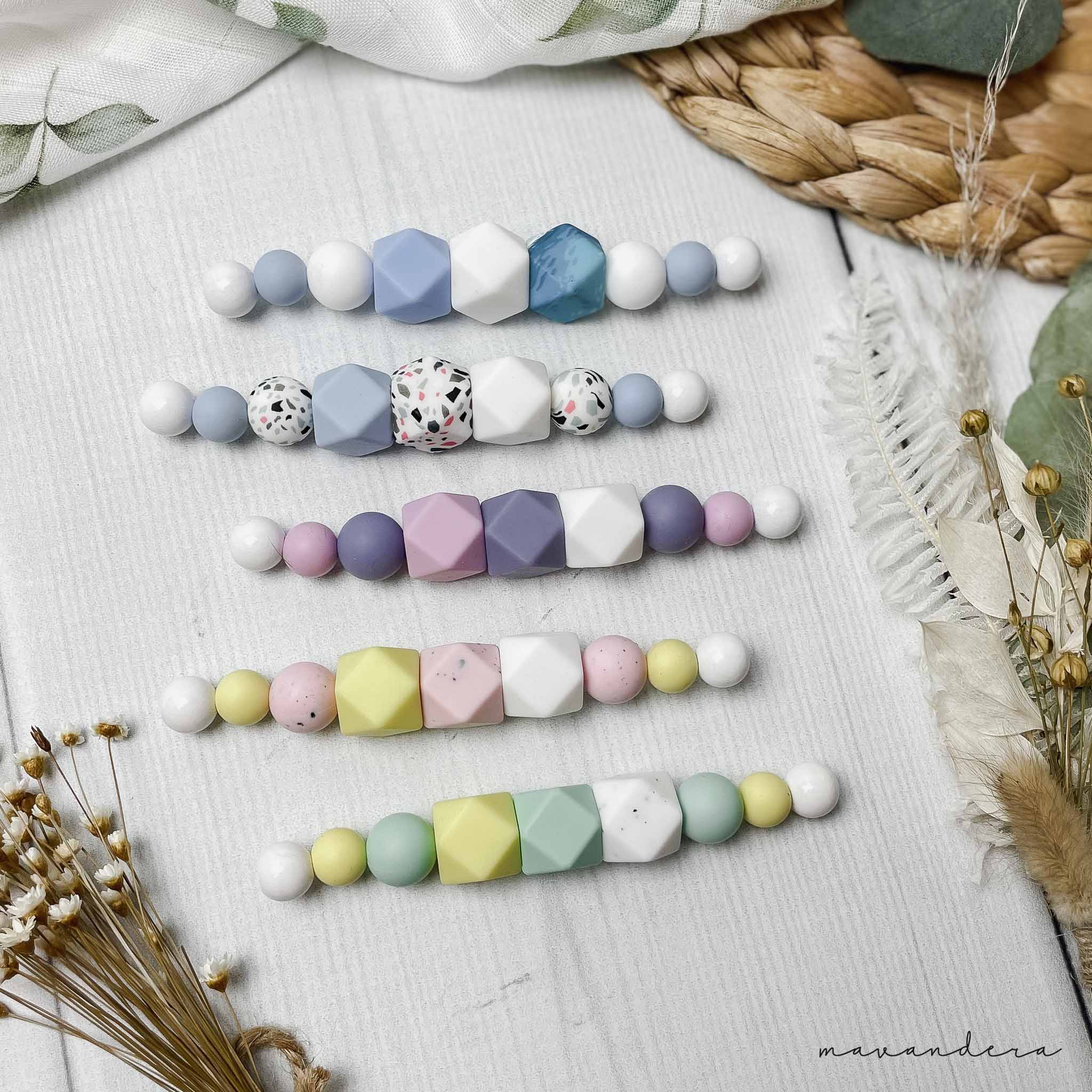 Anfertigung unter Einhaltung der geltenden Sicherheitsbestimmungen – Lebensmittelechte Silikonperlen sowie Sicherheitsverschlüsse an den Enden.